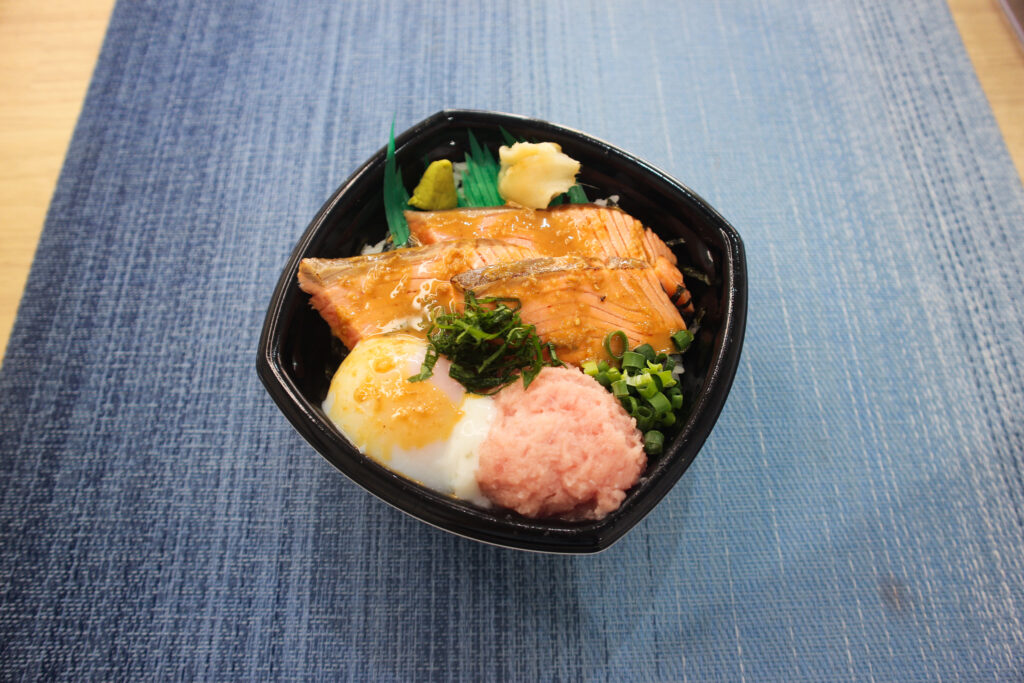 炙りサーモン・ねぎとろ・温玉・大葉・刻み海苔・刻み葱・柚子胡椒香るごま醤油だれ