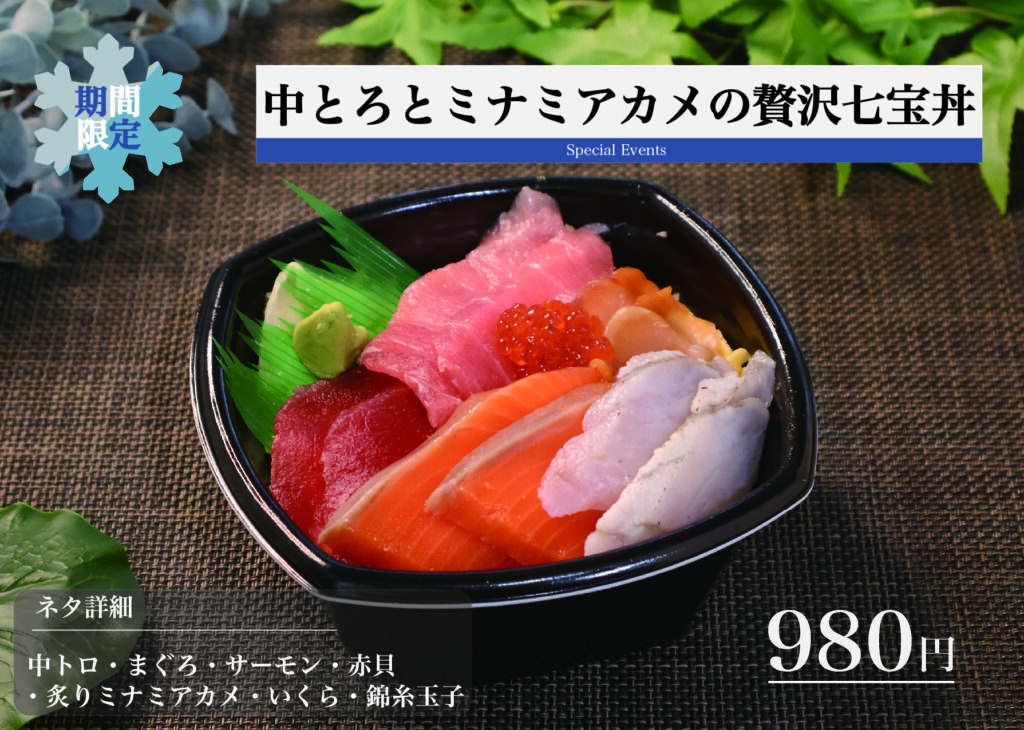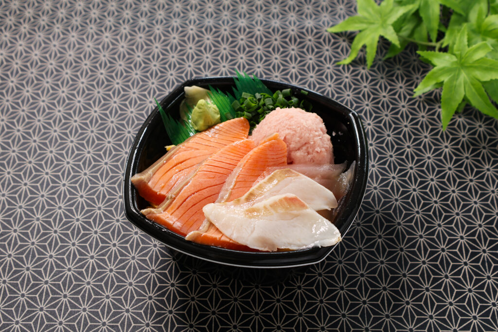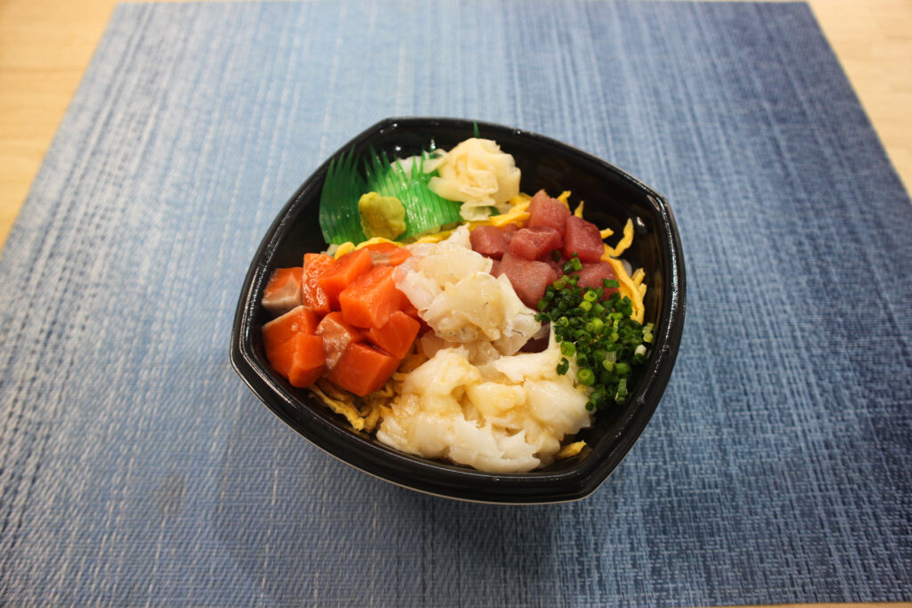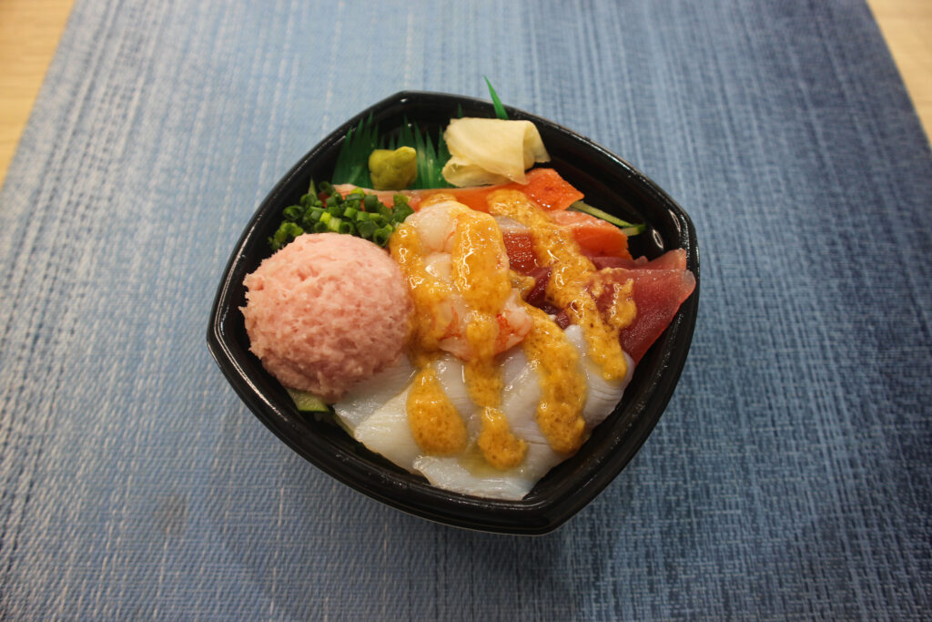 ねぎとろ・炙りサーモン・炙り真鯛・スズキ昆布〆・錦糸玉子・刻み葱・甘醤油だれ(月・火)・まろやかごま白だしジュレ(木・金)