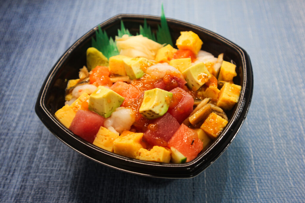 まぐろ切り落とし・サーモン切り落とし・生エビ・穴子切り落とし・アボカド・玉子焼き・きゅうり・刻み葱・黄金ソース