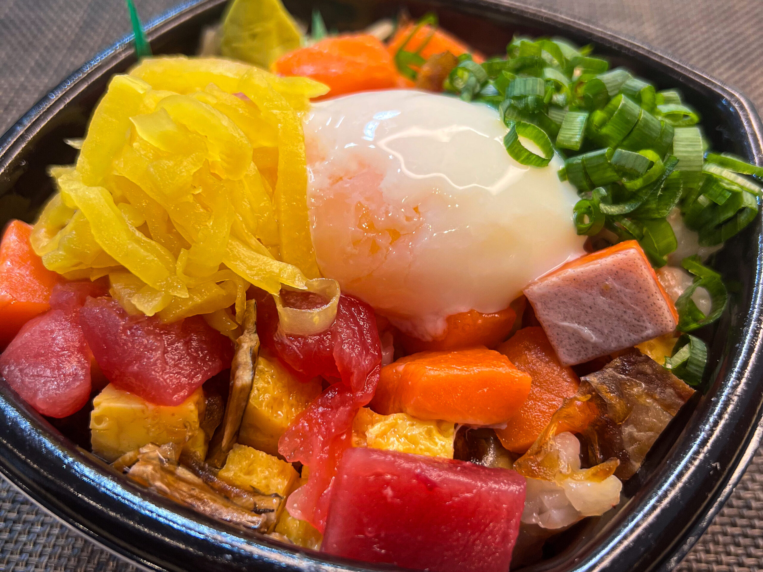 ねぎとろ・漬けまぐろ・炙りチャーシュー・温玉・とびこ・刻みたくあん・刻み葱・じんわり味噌だれ