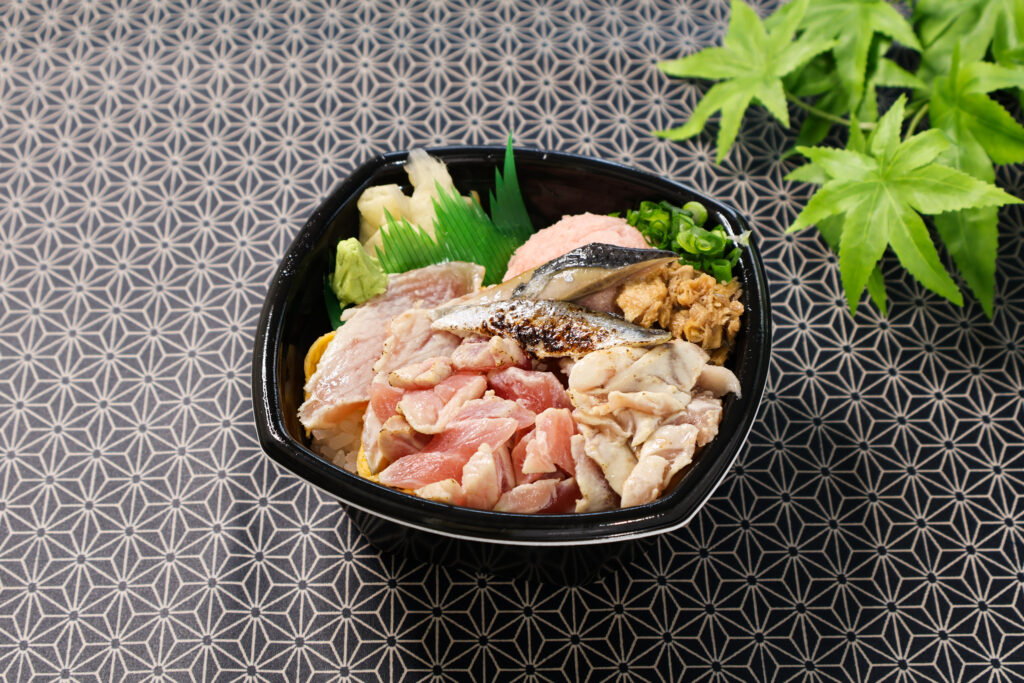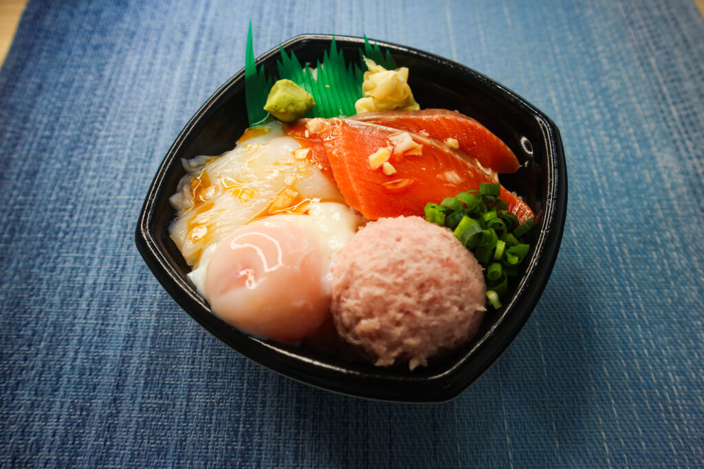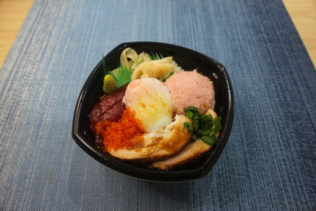 ねぎとろ・炙りビンとろ・炙りビンチョウハラモ・炙りメバチハラモ・炙り〆いわし・まぐろ生姜煮・錦糸玉子・刻み葱・濃厚醤油だれ(月・火)・生姜だし醤油ジュレ(木・金)