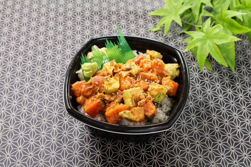 まぐろ切り落とし・サーモン切り落とし・アボカド・粉海苔・白胡麻・フライドオニオン・刻み葱・濃厚サムジャン旨辛だれ