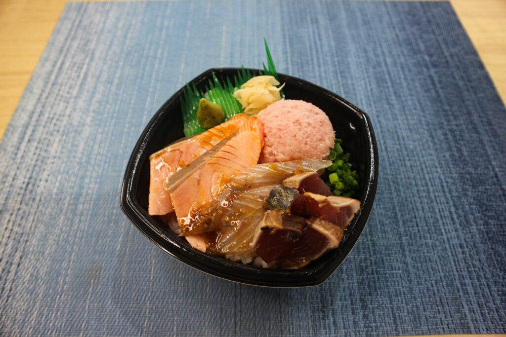 炙りサーモン・ねぎとろ・ヒラメ昆布しめ・鰹・刻み葱・柚子ポン酢だれ