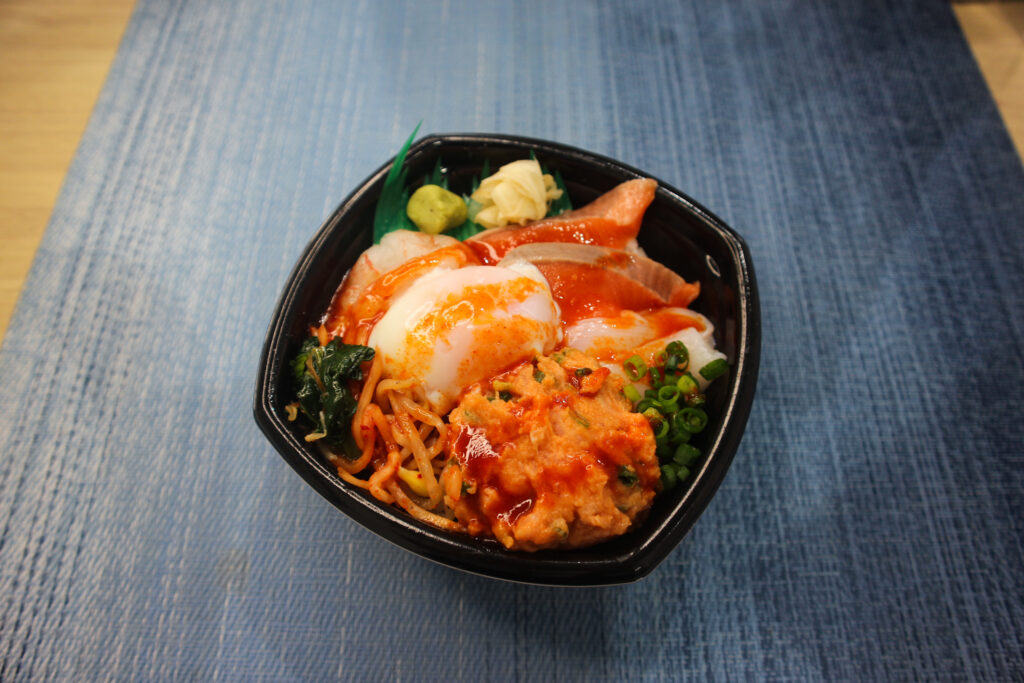 ねぎとろ・サーモン・いか・生えび・温玉・ナムル・白胡麻・韓国海苔・刻み葱・韓流旨辛ビビンバソース