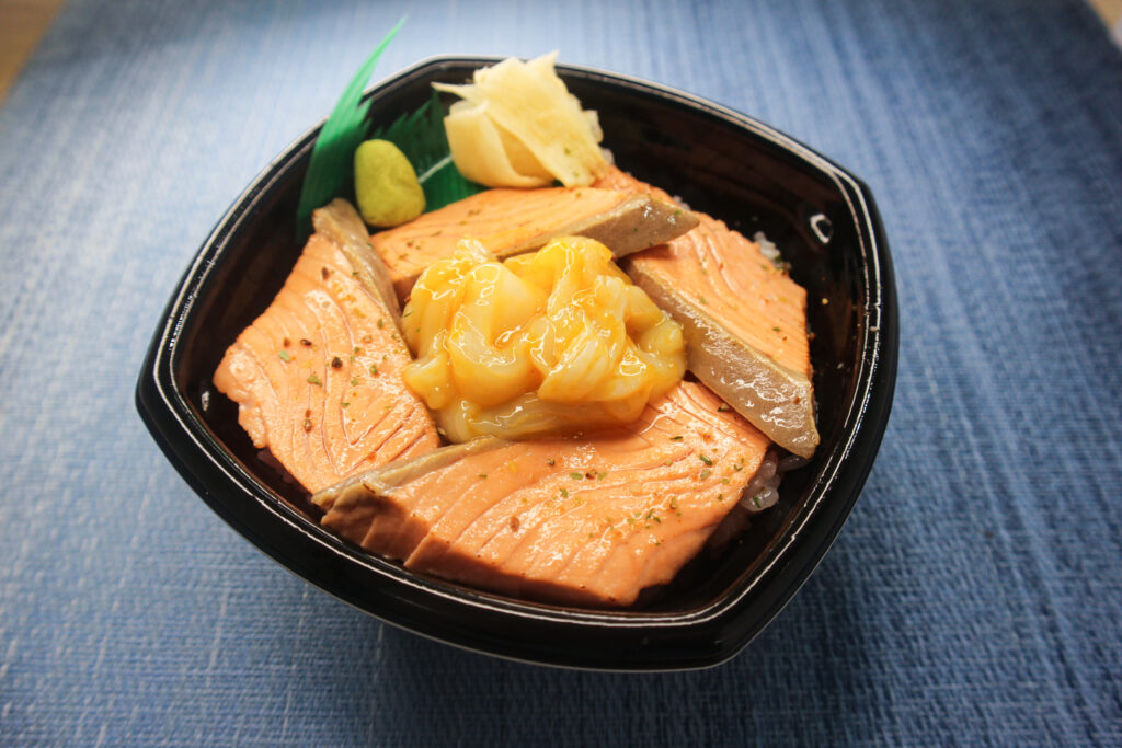 ねぎとろ・炙りサーモン・炙りビンとろ・炙り縁側・炙りはらす・錦糸玉子・刻み葱・西京ポン酢だれ