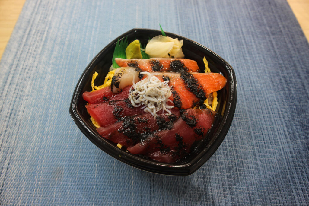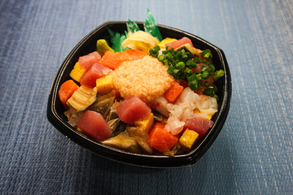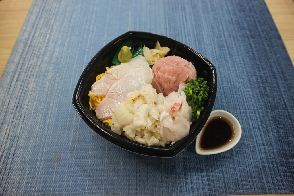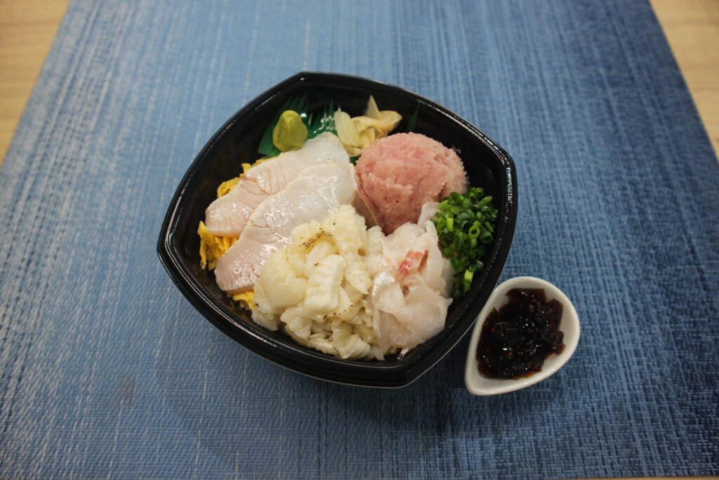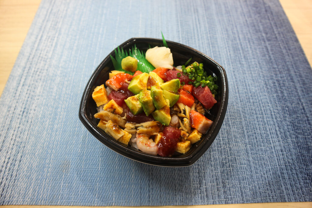 まぐろ切り落とし・サーモン切り落とし・生えび・穴子切り落とし・玉子焼き・きゅうり・アボカド・とびこ・刻み葱・特製オイスター醤油だれ