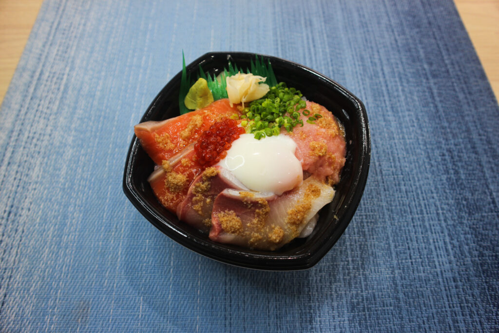 まぐろ切り落とし・サーモン切り落とし・生えび・穴子切り落とし・玉子焼き・きゅうり・刻みねぎ・とろろ明太ソース